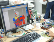 「開発部門からのコンセプトと仕様、開発仕様書に従って設計を行います。手書きの案図をベースに、外観デザインと平行しながらパーツに分割していきます。たとえばMG(マスターグレード)設計の場合、3〜4週間かけて外観デザインを決定し、その外観に収まるように機構(350点位の部品で構成される)を2カ月位かけて仕上げるのです。設計作業に対するこだわりはきりがないので、与えられた時間内で最大限努力します。ただ、同じフロアに、開発、設計、金型生産の担当者がいてすぐに相談できるので大変助かります」と、山中氏は話す。